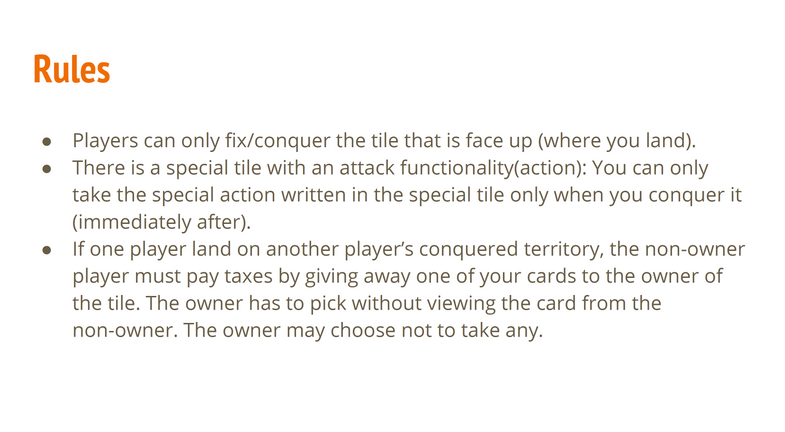 If one player land on another player’s conquered territory, the non-owner player must pay taxes by giving away one of your cards to the owner of the tile. The owner has to pick without viewing the card from the non-owner. The owner may choose not to take any.